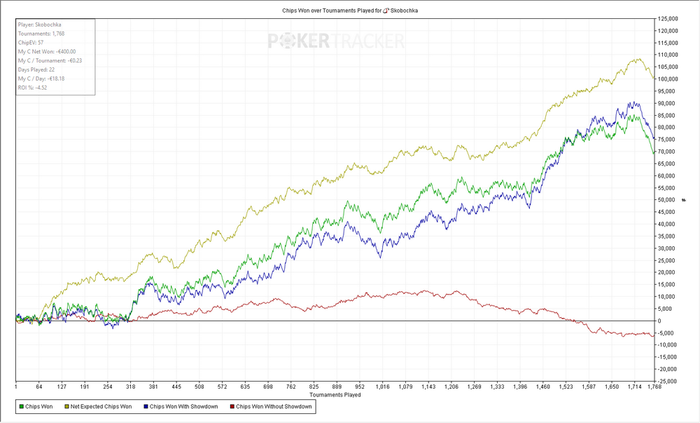 Турниров 1768 ЧипЕВ/турнир: 57.2 Чип/турнир: 39.5 Результат: -385€