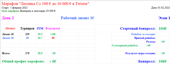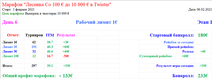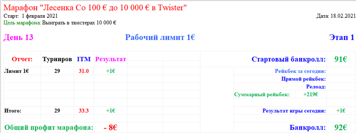 Всем привет! Меня зовут Роман, ник на РедСтаре Skobochka. Настало время завести свой блог, как раз повод есть подходящий. Планирую с февраля поиграть марафоном в твистеры, начну со 100€. Тут буду постить отчеты, рассказывать о впечатлениях и размышлять о дисциплине... Правила будут просты: Стартую 1 февраля 2021 года с банкрола в 100€, начинаю с рабочего лимита 1€, играю сессию 20 турниров, если есть профит отыгрываю его на лимите выше, откатывает спускаюсь на лимит ниже... Играть буду на стримах (ютуб). Небольшое видео с подробностями в самом начале + пробная сессия: https://youtu.be/abj9jzesomk