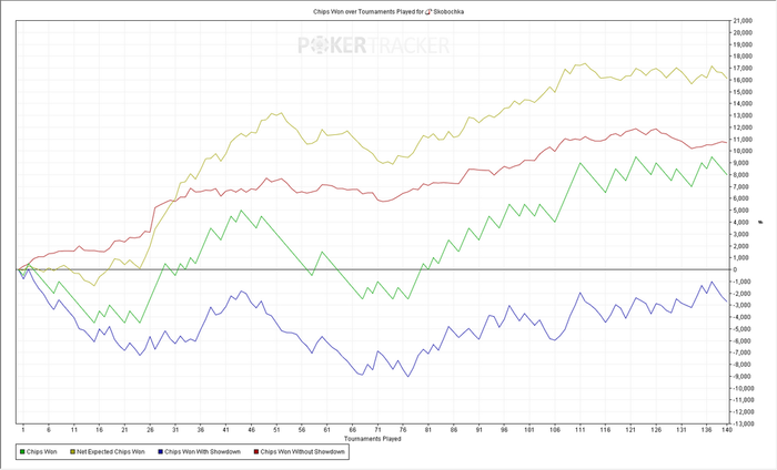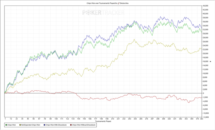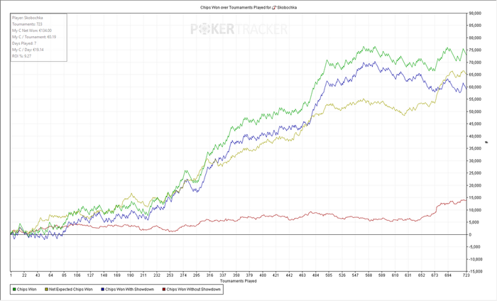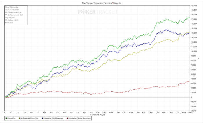 Турниров 3743 ЧипЕВ/турнир: 64.9 Чип/турнир: 80.2 Результат: +257€