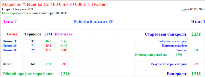 Первая неделя марафона подошла к концу и сделаю небольшой отчет... В этой табличке результат по дням с учетом рейкбека, кешаутов и стартового стека в 100€ По хорошему надо было бы еще добавить 46€ прямой рейкбек, 54€ профита за отыгранные билеты гонок, они были заработаны за первую неделю, но решил добавлять их по факту, в день когда поменял очки или отыграл билеты, поэтому этот профит войдет в следующую неделю. Ну и немного результатов Общий график: Турниров 1861 ЧипЕВ/турнир: 75.7 Чип/турнир: 92.6 Результат: +131€ Лимит 1€: Турниров 946 ЧипЕВ/турнир: 64.4 Чип/турнир: 102.2 Результат: +82€