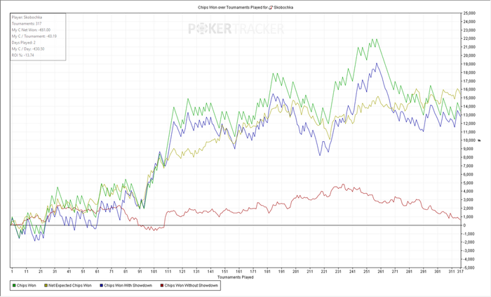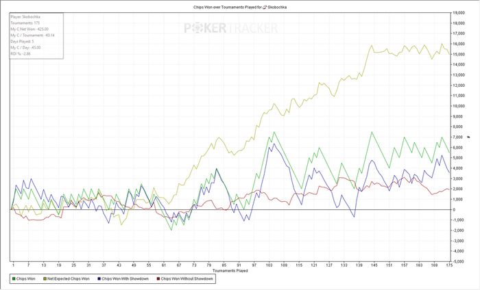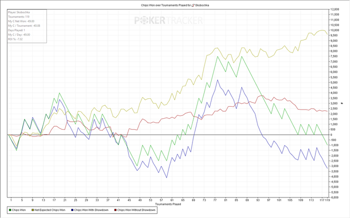 Турниров 16 ЧипЕВ/турнир: -24.2 Чип/турнир: -125.0 Результат: -40€