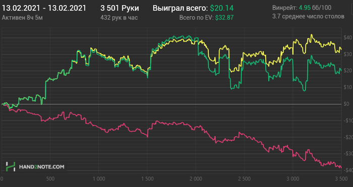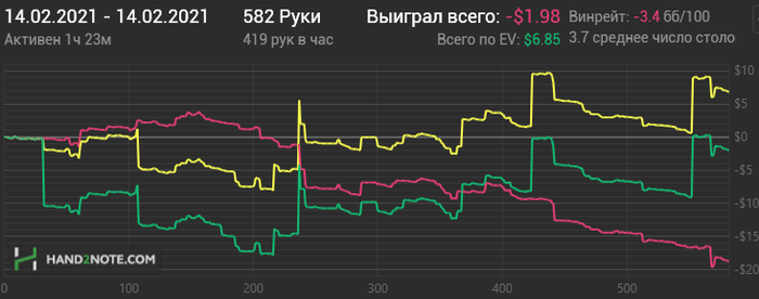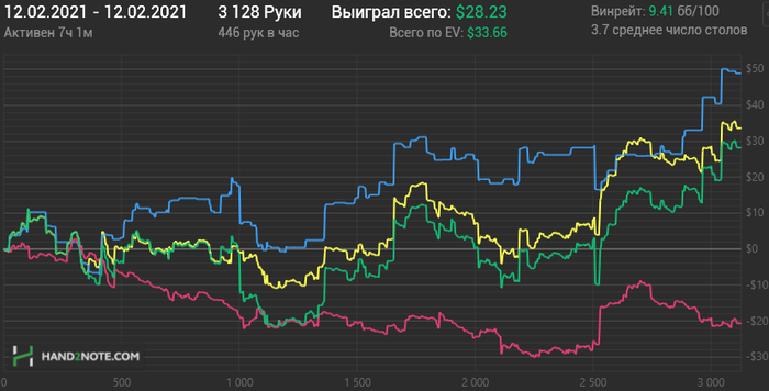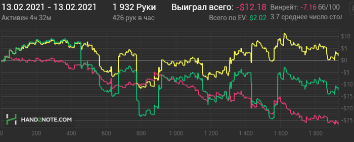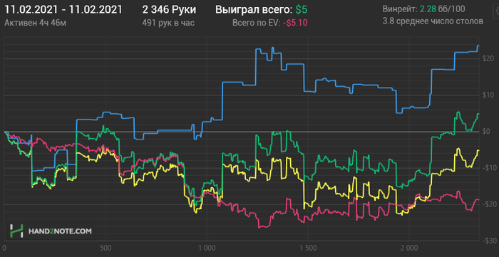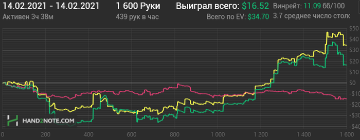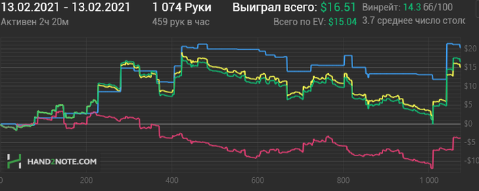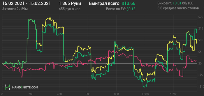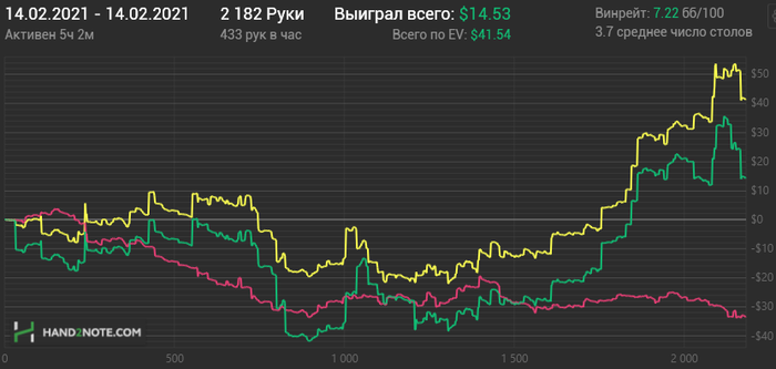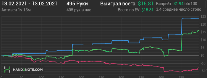 Вторая тоже бодро началась, потом что-то не очень пошло, но всё вытащил немец под конец сессии, пихающий каждую руку и я конечно на переапе словил его с тузами.
