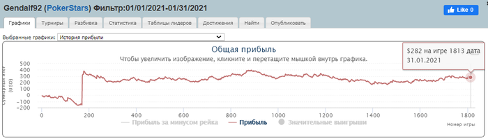 В январе, примерно до середины играл турниры, выиграл 7,5$ Deep Stack - 475$. После этого решил играть только ноки за 3-5$ и иногда подключать турниры и омаху HU HT 3,5$. Общий график за январь и по основным дисциплинам: