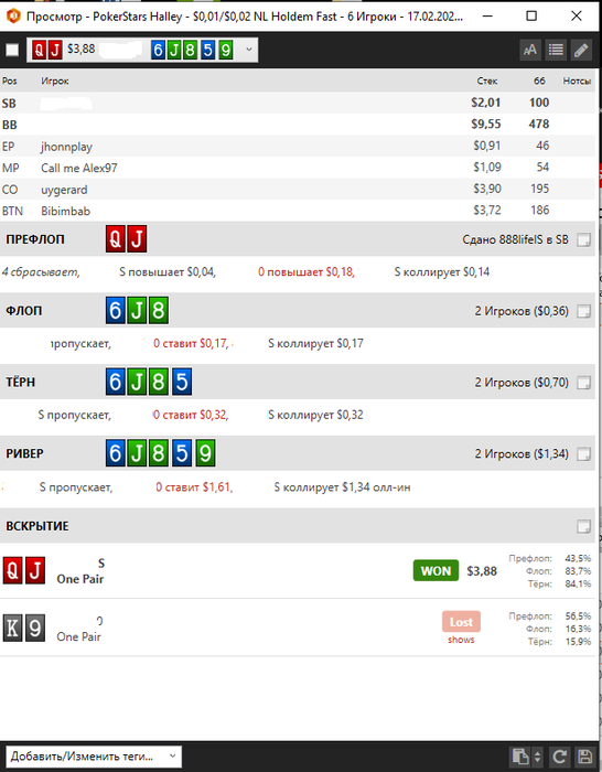 0987654321, По факту что могу сказать, смущает конечно гейский сайз опа в такого рода доску по терну, и тупорылый доблеф на ривере не блокируя ничего из того что здесь отколит. Если брать в целом такую раздачу из учета всей поляны колл ривера минусовый, по факту не могу сказать что сыграно как-либо в усмерть плохо, норм колл флопа, терн хз, его сайз показывает слабость на столь дровяной текстуре ставить менее 50% пота, но стоит ли здесь рейзить не уверен, возможно и стои, но ривер я бы предпочел зарыть. Да это удачный колл но против этого конкретного оппонента на что следует сделать нотс
