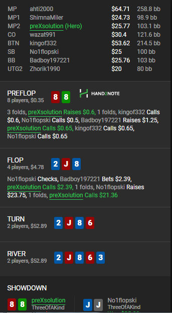 Тоже NL25 Раздача в которой диапазон противника сужается до одной руки Открываюсь с CO 2.4 бб(не открываю меньше с этой позы чтобы всякий мусор меня не коллил) получаю коллы от батона и сб, ну , а бб трибетит. конечно я колю, баттон и сб так же идут в раздачу.Выходит флоп моей мечты, в которой бб кричит что у него КК-АА , ставит полбанка показывая кто тут папка, я, конечно, просто колю, баттон отваливается и я получаю пуш от сб. Это конечно, меня напрягло, как лом проглотил но..что там может быть? Если он не трибетил меня с префлопа изолируя от баттона то там явно не QQ-AA и не АК, , флеш-дро? какое? Надо понимать, что в случае пуша на старзах дается гарантия по EV а значит пушить становиться более выгодно, поэтому я мог положить его только на полублефы с флешдро на 22 или на JJ, я решил заколить потому что JJ , не должен пушить в такой ситуации пытаясь добрать с моих монстров, пуш тут нелогичен, тем не менее там оказались именно JJ/ Насколько правильно я разыграл эту руку?