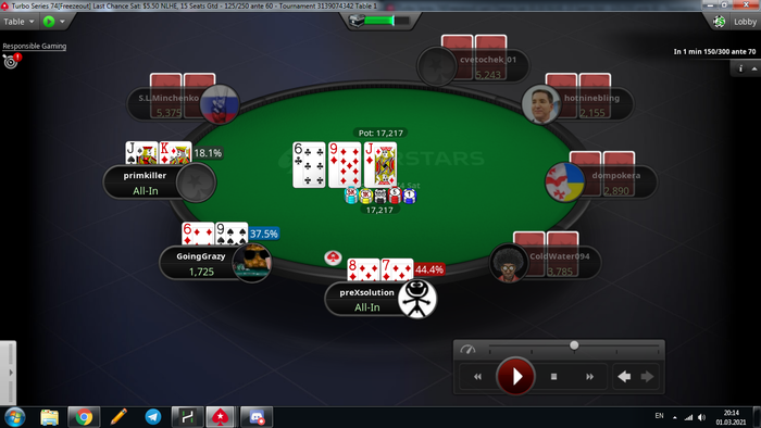 Igor737 @ 26.2.2021 Турнир за 10 баксов с баунти Сложная для меня раздача. С утюга открытия, MP коллит,я тоже на батоне захожу с такой рукой, неплохая для колд колла, можно было бы немного поменьше конекторы, чтобы не быть доминированным но и так сойдет потому как стек у меня просто огромный, можно было бы рассмотреть и 3беты в 4-5 бб, но я пока на такое не способен).Выходит неплохой для меня флоп, с бэкдорами и ненацовыми флешами, но натцовых флешей я не особо боюсь так как АК от MP должны были трибетить, а значит там из натцовых флешей только А9.8.7, (но у опа всего 30 бб и поэтому дип сужается до А10)ложить соперника на одну руку глупо поэтому я флешей не опасаюсь. Опп ставит конбет, я определяю его руку как 10х, потому что сам бы ставил полбанка в такую доску чтобы выбить всяки дро так как 10-тку надо дефить в такой ситуёвине.Я само собой никуда не ухожу с флешдро и 2 живыми картами. На терне выходит дама, и соперник ставит 3/4 пота, показывая что у него сет семерок или десяток, в худшем случая я там увижу 10Q , ставит он так много что мне очевидно, что это либо отчаянный блеф, потому что стек у оппа небольшой и он жаждет банк либо рука которую я озвучил выше, я решаю пушнуть, по шансам, полагая что рук которые я могу бить теоритически больше чем те которые сильнее меня, по итогу оказался неправ. Очевидно что тут пуш не проходит лучше было коллить или фолдить, колл сохранял мне 15 бб, а фолд 25