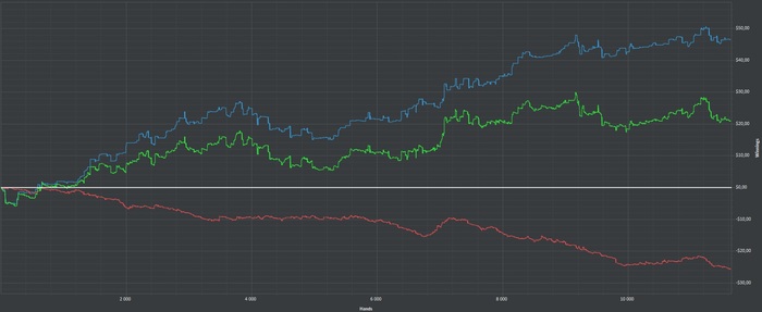 Да не то чтобы надо. Главная линия - зеленая. Если красная вниз, то это значит, что ты много сдаешься. Гнаться за ее подъемом и впуливать стеки со всяким хламом - это просто самоубийство. По моему скромному опыту, если у тебя хорошо поставлен префлоп, то красная вниз не будет падать. На постфлопе ты или вынудишь оппов скидывать до шд (красная вверх), или на шд будешь чаще иметь лучшую руку - синяя вверх. Понятное дело, что всегда и все банки забирать не будешь, но и эти линии будут (чаще красная), как минимум параллельны нулю.