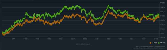 Первые дни я катал шесть столов НЛ 2, но потом случились обстоятельства, сильно сократившие свободное время, поэтому я решил попробовать катать по 12 столов, дабы успеть отыграть хоть сколько-нибудь нормальную дистнацию.( сам знаю, что делать так плохо, но выходов я тогда особо не видел). В итоге я отыграл 66 000 рук и график выглядит примерно так