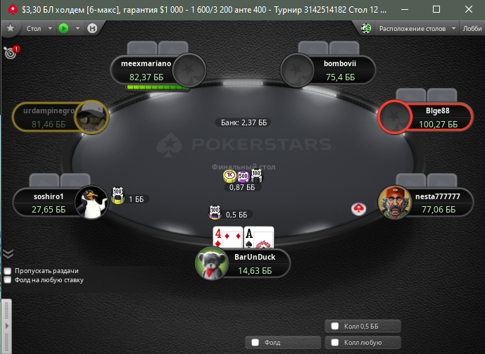 Вообще вылетать должен был первым, но нашел фолд по такому борду на терне, справился, молодец. Самая сложная раздача была за всю сессию
