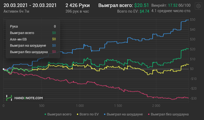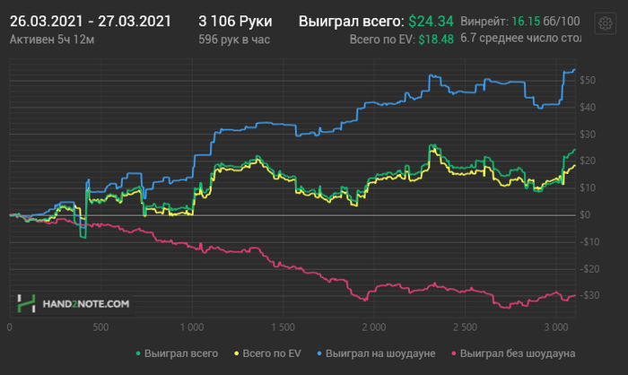 Дела идут неплохо. Допустил ошибку с количеством столов, стал играть по 10 столов и допускал много невынужденных ошибок, из за чего протоптался на месте несколько дней, затем решил уменьшить кол-во столов до 6-8 и вот тут пошёл профит))) Когда я после 17к рук на айпокере нл2-4 евро посмотрел на 2бб/100 я прям дизмораль словил если честно, типа какого хуя , я что не бью нл2?! Но потом понял что дело тупо в том что я не успеваю по кнопкам долбить и иногда отвлекаюсь. Поменял кол-во столов и винрейт пришёл. Вот график. На нём даже виден момент когда я убрал 2лишние стола