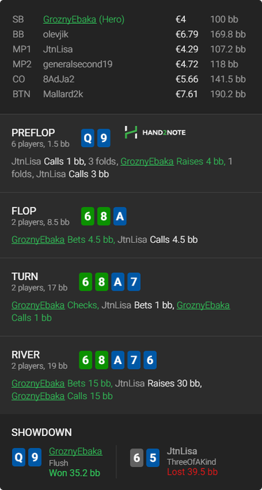 LS13, мне показалось странным что он ставит 1/2 на терне в мой чек. Люди как мне кажется если имеют здесь трипс + то ставят 1/3 чтоб не спугнуть. Поэтому мне показалось странным когда он после ставки пол пота пушит ривер и я почуял неладное. Возможно совпадение просто что у него овера оказались. На дистанции минусово наверное будет
