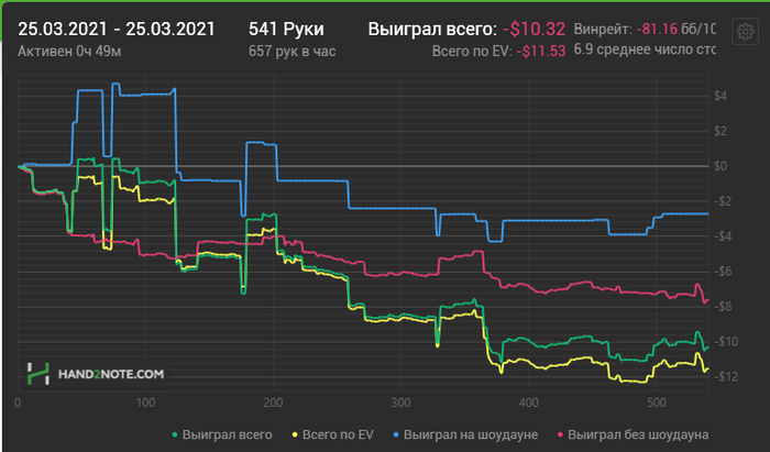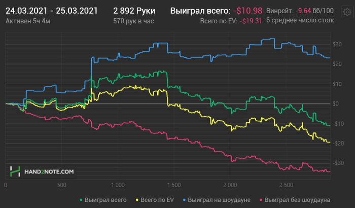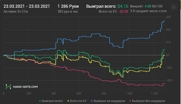 Появились новые мысли о том как можно двигаться дальше в плане заработка. Намерен научиться играть 16 столов по 8 часов в день в солидный плюс типа 8бб/100. Сейчас я играю 8столов максимум, по 6часов, если начинаю играть больше то теряется концетрация. После отдыха составлю и опубликую подробный план достижения цели, а вообще я думаю что есть всего 4 переменные с которыми можно взаимодействовать это: время сессии, кол-во столов, ВПИП, лимит. Наверняка есть и другие составляющие гриндинга о которых можно почитать у Тендлера (чем я займусь также). К таким целям я пришёл благодаря своей работе с весами в тренажёрке. Там есть такая вещь как прогрессия нагрузок которую я ощутил на себе когда начал поднимать веса которые на старте не подчинялись вот я и подумал что ужно это внедрять и в покер. Ещё я изменил график, теперь я просыпаюсь и ложусь позже(ближе к 2ум по мск) так больше фишей