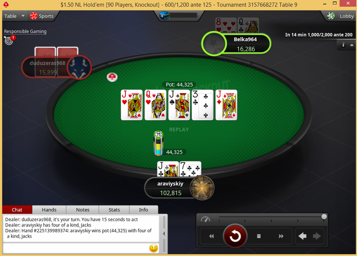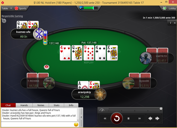 Играл агрессивно, и с 42 чел. постоянно шел на первом месте в одном из СНГ на 180 чел. В итоге дошёл до финального стола, но немного не повезло, раздали кулер АК < QQ, и я потерял значительную часть стека и вскоре закончил на 5-м месте. Остальные турниры - без ИТМ, но с небольшим количеством нокаутов.