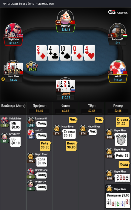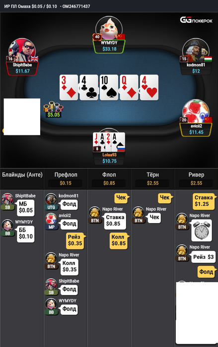 Ну и по риверу всё достаточно просто. У противника к риверу остался полярный диапазон, либо там воздух, который даже не способен на блефкеч(за исключением КК и изредка возможно рандомными дамами, и то не факт), либо трипс+, поэтому ставить на велью с тузами нет смысла, тк добрать тут можно будет только с КК, либо ты доберёшь сам с себя с каких-то комбинаций с 4кой(как скорее всего и произошло в твоей раздаче), остальное просто всё выбросит(есть также небольшой шанс что по такому розыгрышу и твоему префлопдиапазону тебя тупо решат заблефовать, но это очень маловероятно конечно). С другой стороны можно половить какие-то блефы, ну и тонкий вельюбет с тех же КК. Остаётся только чек-колл, и обязательный нотс, с чем таким образом разыграл такой флоп враг, как то так. Будешь думать в таком ключе и обязательно писать нотсы, ты очень быстро продвинешься по лимитам....
