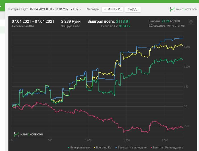 Вчера октатал в общей сложности 11 часов и 5к рук, начало было за здравие а закончил не особо) В который раз убеждаюсь, что сессии надо катать не более 4 часов. концентрация падает , а это минус ев даже если хорошие столы.