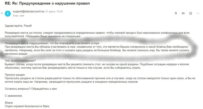 BELGAZ, я в том году не знал этого правила когда начинал катать, мне пришло письмо, не помню содержания. После этого я всегда проставлял блайнды, и мне пришло опять 2 недели назад, я в ответ уточнил сколько мне нужно играть чтобы они меня не заёб.вали. Вообщем они сформулировали, что я должен сыграть хотябы одну радачу, а вот считается ли фолд на бб за такую раздачу хз.