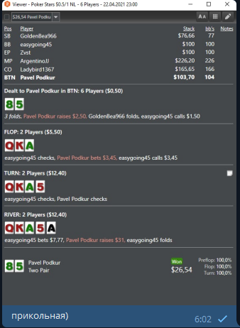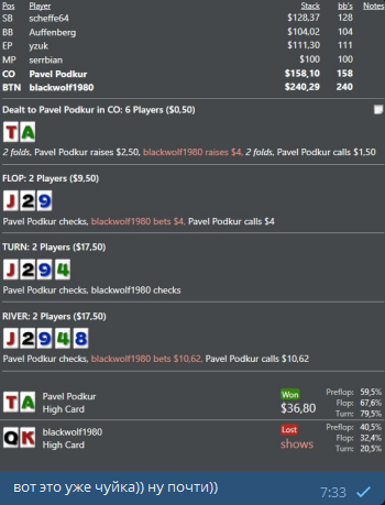 P.S. вчерашняя сессия была одной из лучших в моей покерной карьере, даже не смотря на сумасшедший переап