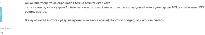 averzia, он у меня тоже пытался в долг взять. Но я смотрю человек на обмен 3-4 раза в день выходит. Обменял --- Проиграл ---- обменял и так по кругу. Человек не может остановиться если проигрывает. Потому я ему не стал давать.