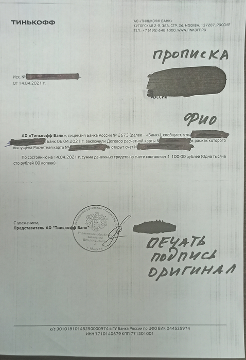 Достаточно было открыть новый счёт в Тинькофф и получить такой документ