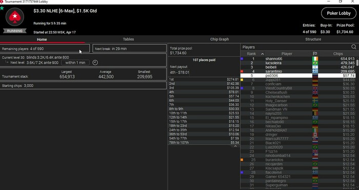 Начал играть в основном СНГ 45макс за 1$ и подключал МТТ с низким АФС так же за 1$. Когда БР подрос до 300$ начал понемногу подключать СНГ 45макс за 3.5$ и все МТТ с низким АФС до 3,3$ включительно. С БР 500$ полностью переключился на МТТ до 5,5$. На данный момент БР 1362$ и АБИ 5. Катаю от 1.1 до 11$ преимущественно (не верю в чудеса) с низким АФС. Загрузка 6-7 часов, потом доигрываю что осталось, сессия в среднем 10-12 часов. Больше 6-и столов одновременно не играю, пробовал, не получается. Гиперы не играю вообще, турбины только сателиты, но в последнее время и их перестал играть. Саты хорошая тема казалось бы, но потом катаешь в турнире не по БР и игра ломается (не знаю кто как у меня так).