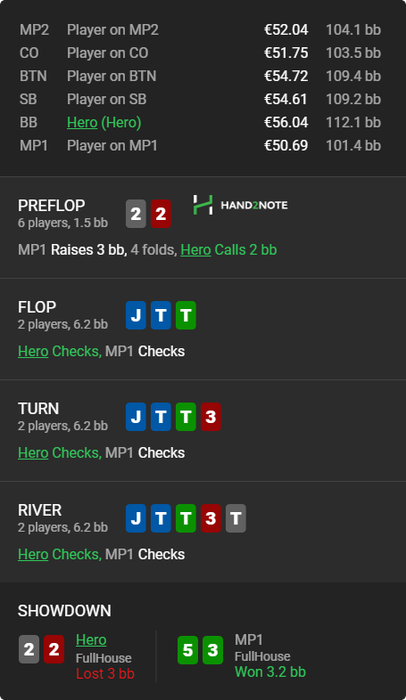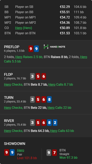 Так вот, всё - да не всё. Вот статы на него: VPIP-23, PFR-17, 3BET-5,6 (да да Карл, именно 5,6) проход до шоудауна 28, WWSF--52 (да-да), и та-дам!!!! выигрыш на шоудауне -82% (так-то вот и не меньше). Что еще? Ах да, наш винрейт есессно +62 бб/100 (по EV +38). Игра с позиций рейз фёрст: UTG-11, MP-17, CO-25, BTN-61(как же удобно в позиции на всех) SB-18. Лимп-2 в среднем по всем позам кроме BTN, там мы не играем лимпом. Выборка у меня не очень большая на него - 824 руки, но я думаю позволяет получить приблизительное представление о стиле соперника.