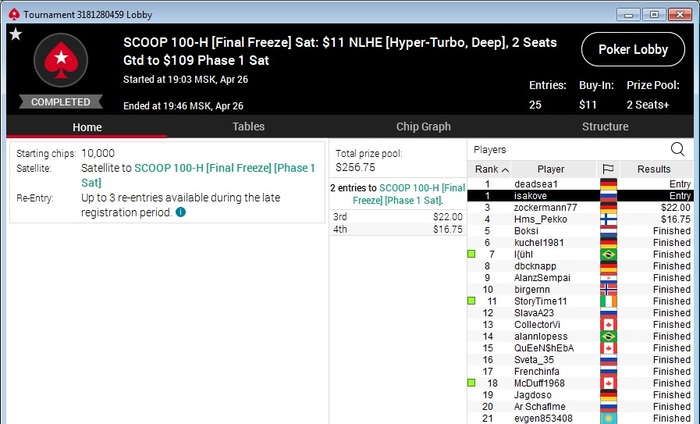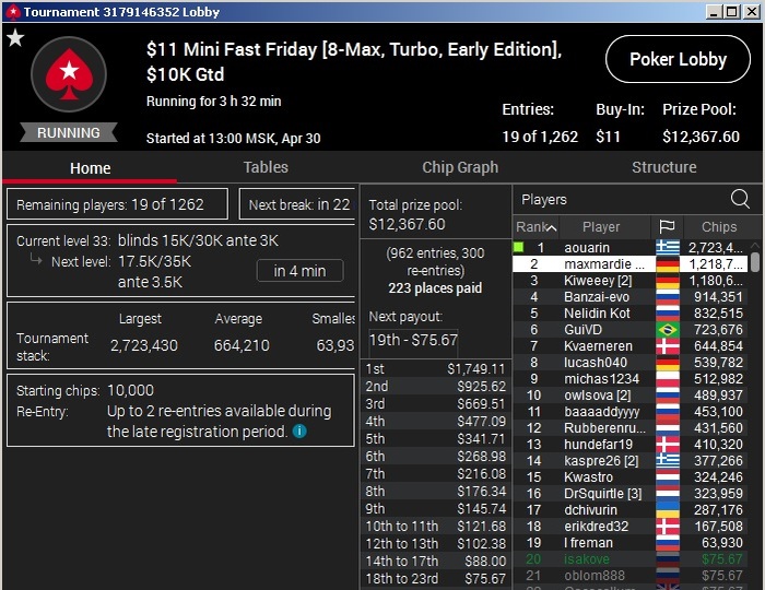 С 0,08 на пс отобрался на 1 биг, прошел в мин итм 3 дол, раскрутился до 8 на нл2, через саты попробовал отбираться на вечерний скуп, смог на 11 пко, но попал в аа с кк, через фриролл прошел на фазу за 11, прошел 1 фазу на 109, но без итм, итого все ушло в 0 бр.