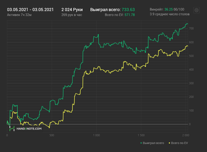 наелся на сегодня, особенно на ГГ Это нечто, я конечно не сторонник концептуальных теорий, теорий заговоров, массонов, тамплиеров, и ми-6, но ГГ как-то уж больно неплохо открывается карты ривером, которые до ривера имеют эквити в районе 5-20% Ужжж больно часто, увозят в вперёд ногами нахуй, ой простите за мой испанский (переиграл наверное на Испански старзах) уж боль странное дерьмо господа, а про недоезды и переезды сегодня , молчу, как скзаал мой один товарщи, с общим переапом за +- полгода в 1.5-2 раза, ты не имеешь права ныть что тебя переезжают, так что молчу, но ппц, неприятно, выставиться по флопу 80+% а на ривере увидеть "заветные" 0%. Набираемся сил, и будем демонстрировать свою мощь, не сегодня канешн, но пооозже уж точно, график п о к а з ы в а ю