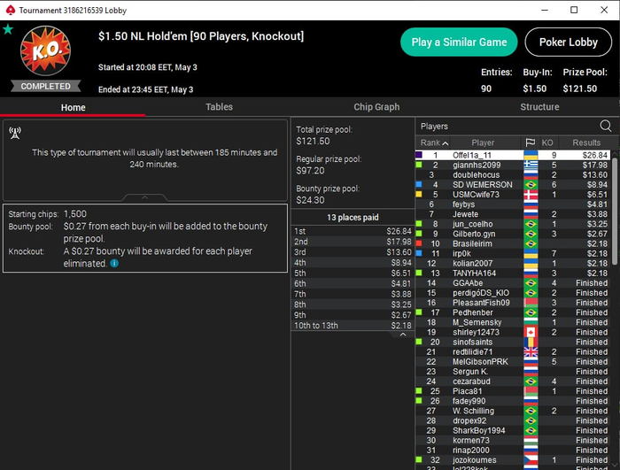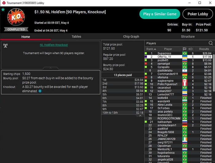 Занёс вчера турик, + подклбчил акк на ПС. ЕС взял топ 3 в каком-то супер стэке КО за 3евро, не помню сколько дали, но скрины поподкрепляю, ощущения смешанные ибо начало сессии по ощущениям было не очень, а потом как-то подсобрался и начал рвать) в топ 20 бига по 1.1 зашел, 3 место на пс ес, и выиграл билдер за 2.2, приятное чувство, сессия получилась практически 12 часов, и самое забавное что закончил играть в 7+- утра, а у самого в 8 20 уже экзамен в универе, благо дистанционно, и есть +- какие-то знания чтобы не напрягаясь этот экз сдать, по этому сегодня отдых, думаю над отдыхом и завтра, ибо уже 1.5 суток я не сплю, как-то не выходит, дела , заботы, но в целом разумеется я рад, знаковый момент в покерный карьере, уже на моем счету серьёзная победа в турике, не считая фрироллы( да-да и такое тоже было) могу по приколу скрин так же предоставить)