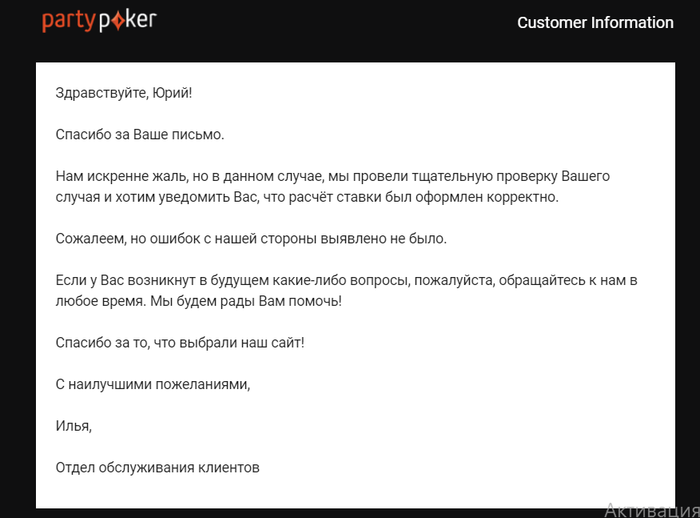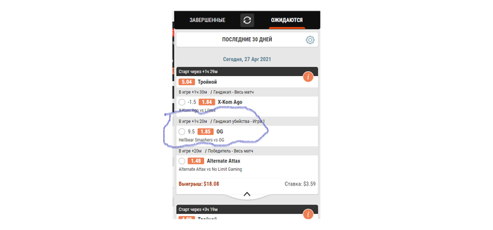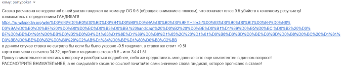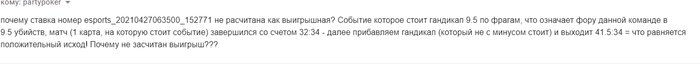 Если в кратце, ставил на собитые (дота) гандикап убийств команды (9.5) на первой карте, что подрозумевает плюс к убийствам команды 9.5 фрагов (если википедия не врет про определение ГАНДИКАП, и мой опыт меня не обманывает), обращаю внимание не МИНУС 9.5, а +9.5! скрины ниже! Игра закончилась со счетов 34:32 - итог 34:41.5 = победа! саппорт не адекватен, скидывает отписки со ссылками на результаты матчи, которые я и так не оспариваю! вообщем, смотрите скрины, анализируйте! Разберитесь и выплатите ставку!