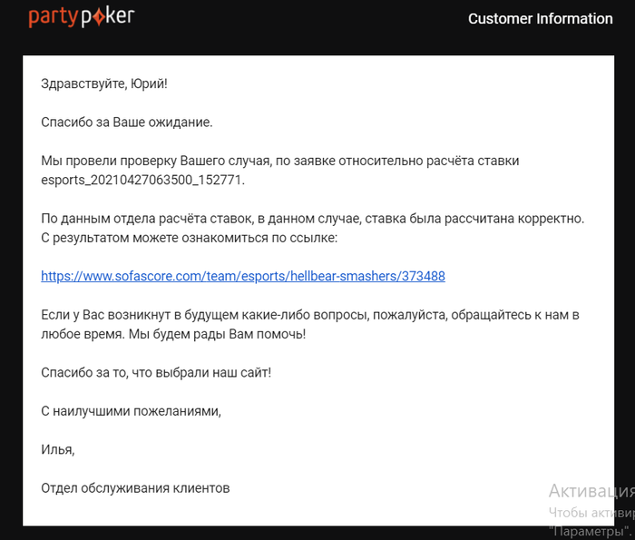 Доброй ночи! Прошу разобраться в ситуации и выплатить ставку! Если в кратце, ставил на собитые (дота) гандикап убийств команды (9.5) на первой карте, что подрозумевает плюс к убийствам команды 9.5 фрагов (если википедия не врет про определение ГАНДИКАП, и мой опыт меня не обманывает), обращаю внимание не МИНУС 9.5, а +9.5! скрины ниже! Игра закончилась со счетов 34:32 - итог 34:41.5 = победа! саппорт не адекватен, скидывает отписки со ссылками на результаты матчи, которые я и так не оспариваю! вообщем, смотрите скрины, анализируйте! Разберитесь и выплатите ставку!