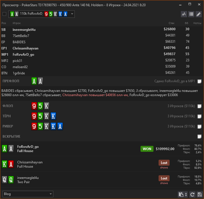 Это мой любимец) Турнир в котором мой рой на 370турниров 55% и самая большой профит из всех видов турниров) Отличное время проведения , идеальное на мой взгляд афс , между 300 и 600 , потому что означает достаточное количество хобби игроков + не завышенный афс , которой создает большую дисперсию. На этот раз снова немного не хватило до крупного заноса , особенно приятно занимать здесь первое место и забирать все ноки) А я буду продолжать приглашать вас вместе со мной поучаствовать в подобных турнирах , которые я выставляю на бекинг , это 109 Батл роял в среду , 109 Сатудей в 2-00 по мск , 162 баунти билдер в 3-30 по мск , по выходным эти турниры на заглядение) Считаю очень выгодным вложением денег , так как вы добавляете себе сыгранный турнир в сетку , при этом его не играя) а я получаю дополнительный турнир с высоким баином , все в плюсе)