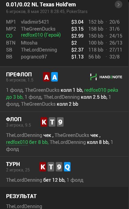 Ощущение очень стремной раздачи. На префлопе рейзил потому что хотел остаться 1 на 1 с человеком по статам 100/67. Ну и колл 4 бета, потому что слишком маленький сайзинг, 5бб за 36 бб тогда казалось, что не дикая ошибка и можно поехать в монетку ( возможно тильт после предыдущей раздачи). На флопе после префлопа не понимал с чего могу добрать. там по сути только АА,АК, КК после 4 бета, поэтому чек выглядел неплохо. Терн скорее всего надо было тоже играть через чек, потому что по сути вышел бланк. По риверу возможно просто колл, но опять-таки. а чему я проигрываю? Не так много комб, а оппонент, в моем представлении, мог по любым двум парам так играть.