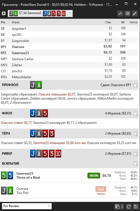 Спасибо fleuvedemerde за проявленную доброжелательность и проведенную тренировку, поставил на путь развития покер про, и указал на очень большой лик в виде нехватки агрессии. Будем учиться