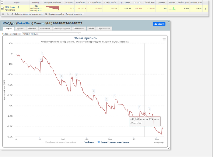 Сложилось не очень! Сыграл 313 туриков, профит -2919$