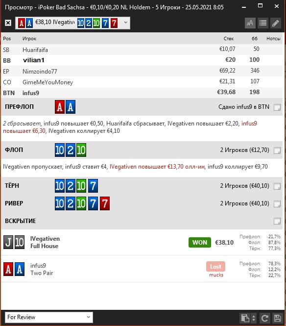 Уже в Апреле делал неплохие вылазки на нл 50 под уважаемых граждан, в мае мои вылазки закончились очень грустно (больно рассказывать такие вещи, ха-ха). Далее я добил долгожданный сундук (играю без рейкбека, ужас), а в сундуке старзы поощрили меня АЖ пятью! (5) американских президентов, о БОГИ, спасибо старзам за это, я на них немножко обиделся и пустился в свободное плавание, перешел я значит в новый рум , думаю залечу на нл 10, посижу нитом, послежу за тенденциями поля, да и вообще как себя ведут реги, как себя ведут уважаемые и каковы пропорции и тех, и других. Сижу я значит наблюдаю и схватываю за 14 тысяч раздач такой виток диспы, что я своему злейшему врагу не пожелаю (я играл не по красной для общего понимания, а играл по красной в пол и вот что получилось):