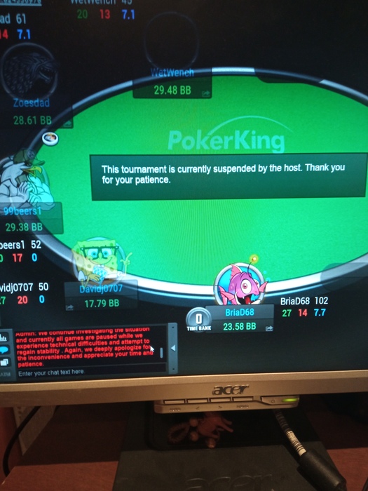 Играю я в ночь с 24 на 25 мая 2021 пару туриков на ПОКЕРКИНГе, в одном дело ближется к ITM и тут появляется сообщение, примерный перевод такой:"Турнир приостановлен организатором. Спасибо за ваше терпение." Причём это паралельно и во втором турнире.