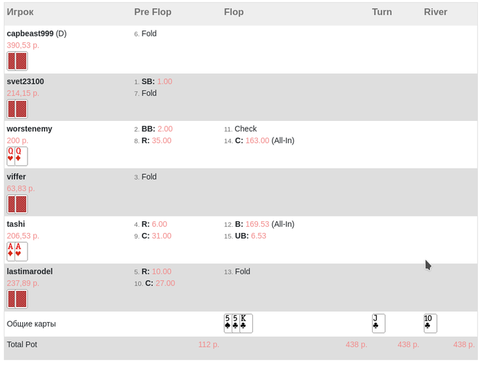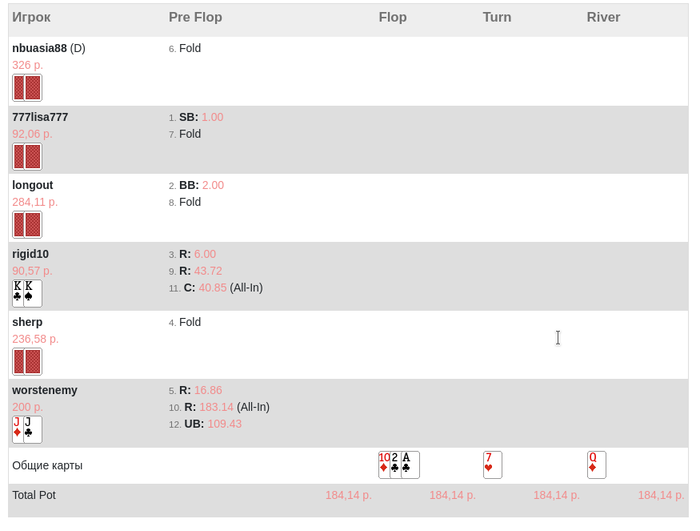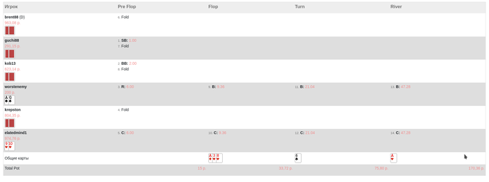 На ривере большую часть диапазона оппонента будут составлять трипсы. Для колла нам нужно, чтобы он ставил большую часть своих карманок, что маловероятно, поэтому тут тоже фолд.