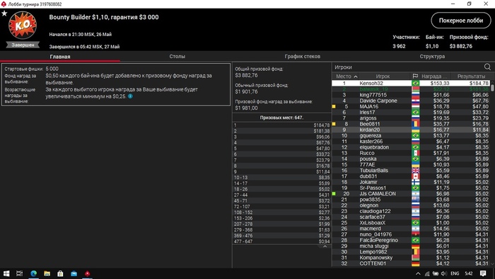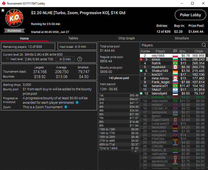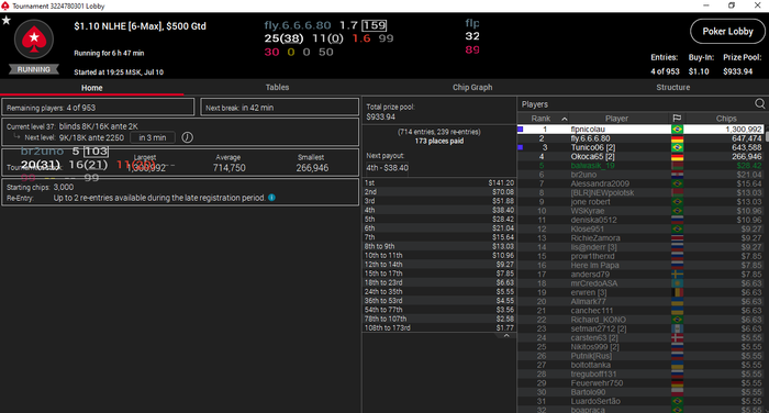 Попробовал поиграть подороже и мне понравилось) Проанансировали мне расписание на работе, совсем уж мало выходных будет, так что решил не делать плавным подъем по лимитам и сразу грузил 5,5 и даже 3 турнира за 7,5. Аби вышло 3,5. Начал сессию совсем хорошо, запрыгнул на финалку но так и не побывал на ней, выбыл одновременно с 10-м местом, но чуть позже и по итогу топ-9)