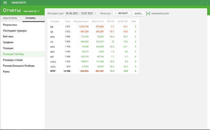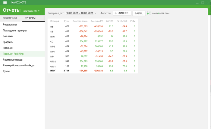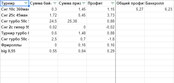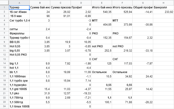 Установил себе недельки две назад х2н бесплатную версию, но прога почему то не в состоянии даже нормально результаты турниров отфиксировать, поэтому я веду табличку, где отображаю результаты за месяц по каждому из турниров, делаю разбивки на пко и не пко и по бай-инам. Вот так она выглядит, вот так она смотрится...