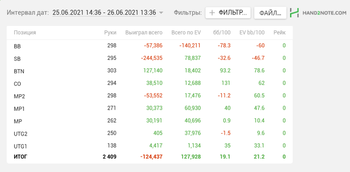 Небольшие недоборы и там и там, но на такой дистанции достаточно ощутимые, в сумме 660бб. Но ничего, надеюсь вернется. Бью ли я лимиты? Узнать это поможет нам Дима spr3216. Недавно на своем стриме он заявил, что если имеешь винрейты 10-12 бб/100 и 8-10 бб/100 с фильтром до 60бб то лимит в принципе бьешь. Ну общие винрейты +, с фильтром ну такое если честно, но 8 бб/100 по EV-хе наскребли. Так что думаю да, бью. Но это АБИ 1,8. Сейчас я уже прыгнул на АБИ 3+. Вот там и посмотрим на что мы годимся.