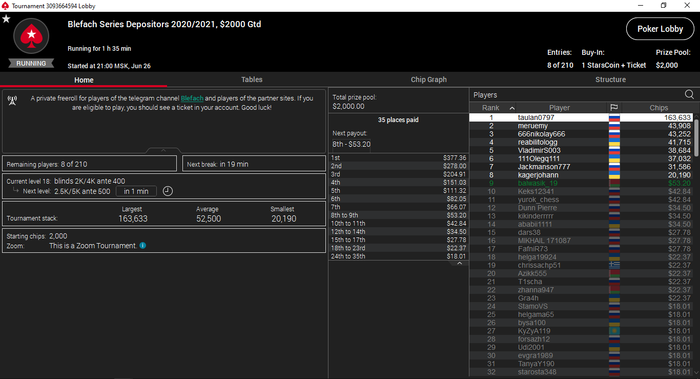 Pokerstars 35 турниров (266,25$>>>656,22$) Профит: +389,97$