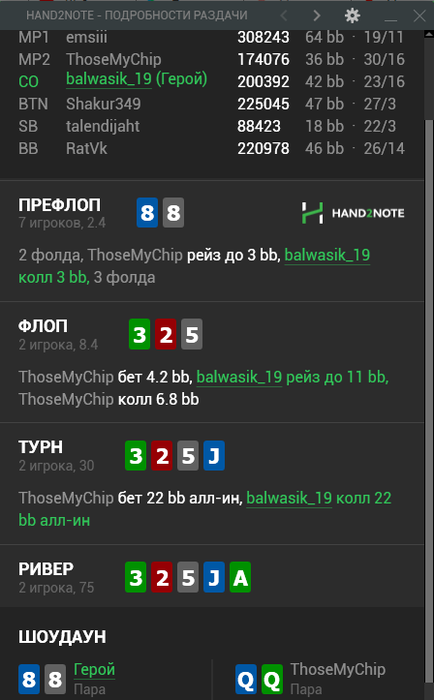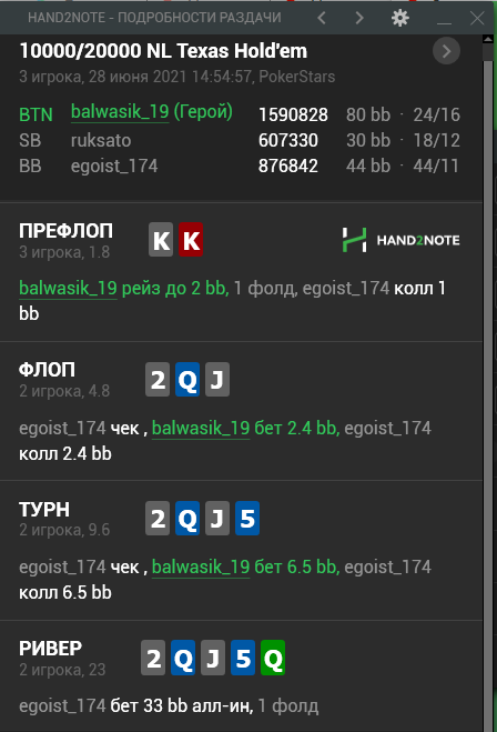 Дальше я набил хорошие стеки+баунти в ББ за 3,3 4,4 и 7,5. Но потом началась открутка и начали пихать, про победы в монетках я вообще забыл. При чем когда выставлялся с оверкатами против пары всегда они проходили по одному сценарию: я ловлю свои ауты, но на ривере обязательно оппу доедет сет.