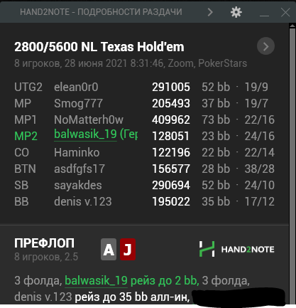 В общем дальше я перехватил инициативу, начали сдавать получше, тайт отдал весь стек и я его выбил АК>AJ,когда у него 10бб осталось. ХА продлился 5 раздач. У меня было 60бб у отсаженного 20. И он просто отдался в мой флеш...