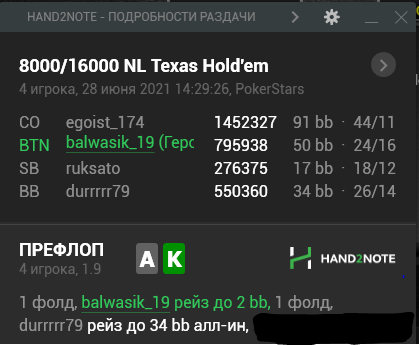 Тут у меня не было сомнений, что у чела дама, потому что он много блефовал, но не ол-инами. Такое он исполнял раза 3, и все разы я сбросил хорошие руки и думаю был прав. Потом пришлось выбрасывать АК на пуш 30бб+ пуш, потом кстати и эту раздачу скину. Логика простая, даже если кальк покажет что это колл, я не согласен. Я уже понимал против кого имею дело и играть монетку против условных 88 не хотелось. Я чувствовал что их можно и надо переигрывать, один тайт, второй идиот-лимпер. Кстати тайт тоже тот еще долбаеб, вколил в будущем пуш 15бб на Т9с) Молодец) Что же касается лимпера, на лимпы которого я просто рейзил 3,5х и в 90% видел фолд. Эта раздача от него просто шедевр)...