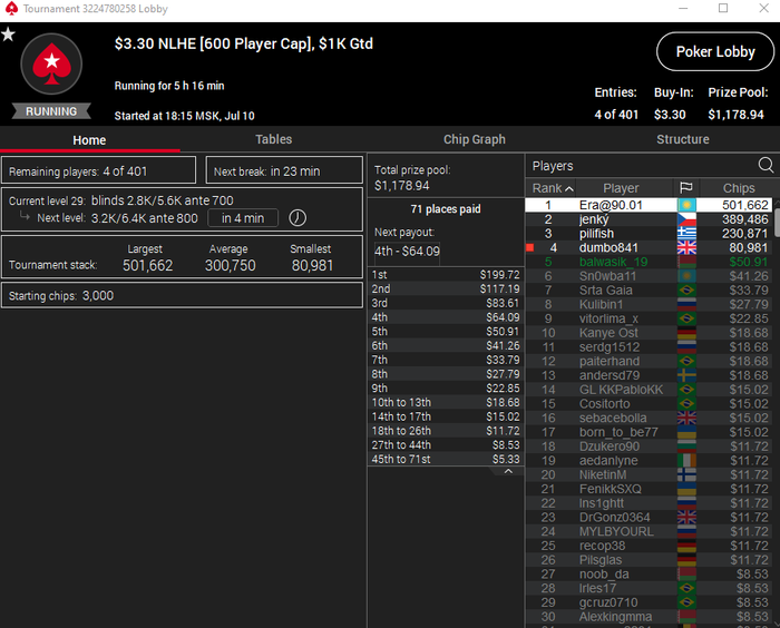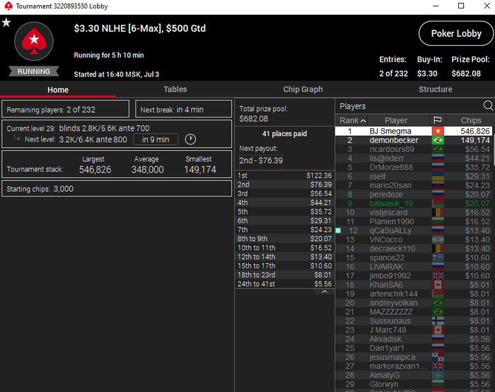 Третья финалка уже за 3,3. Турнир с низким афс, турнир хороший, хотя там обычно составы поприличнее, но я люблю такие турниры, диспа пониже, так что отличный турик. На самом деле плохо помню этот турнир, но вроде как супершортом вышел на нее, пару удвояшек позволили забраться снова на пятое место...