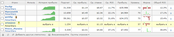 Крайне противоречивые статы. Я тут как зарекался на счет агрессивной игры, вроде бы и старался играть агрессивно, но ее и в помине не видно. WWSF очень мал, мало 3бетов, хотя поле широко колит 3беты, поэтому и мало это делаю в блеф. Ну хотя бы впип/пфр отличные.