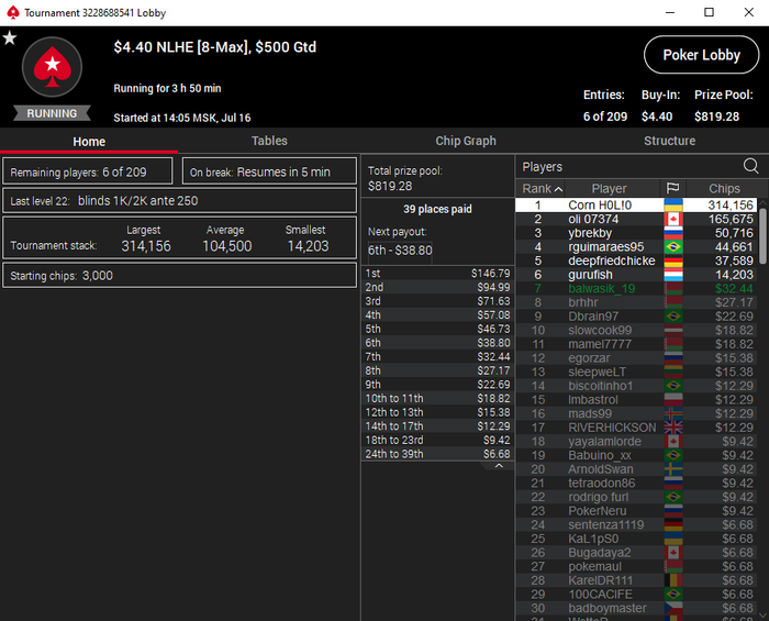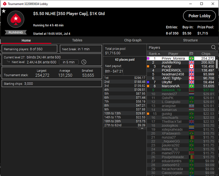 Pokerstars 19 турниров (233,92$>>>218,32$) Профит: -15,6$
