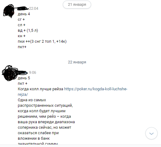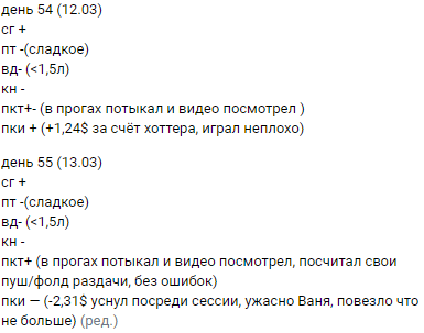 Потом случился январь-самый лучший месяц в армии для меня. Меня отправили в командировку в другой город и я обрел спокойствие, отдых от поднадоевших начальников и режима. Мы работали в день от силы часов 6, все остальное время отдыхали, вот реально отдыхали, от живота кушали, ведь со мной были люди из этого города и им чуть ли не каждый день родители привозили харчи, заказывали пиццу и шаурму(надеюсь мой единственный читатель не из СПб, а то и его сейчас потеряю). Я каждый день читал статьи, уже дошло, что нужно читать про техническую часть покера, ведь я на таком уровне был, что мне были бы полезны банальные статьи про азы, как разыгрывать тптк, фд, сеты. И именно в это время как мне кажется начало зарождаться хоть какое-то понимание и был дан наибольший буст скиллу за все время. Но этим я не ограничился и решил поставить себе цель: до конца армии писать ежедневные отчеты вк сам себе в сообщения. Помимо покера они включали прочтение книг, распитие воды(не менее 1,5 л воды в день), а так же пункты по питанию(бросал есть сладкое и мучное) и курению(начал курить в армии и решил бросить). Помимо статей в покер я играл. Да в онлайн покер двери все еще были закрыты, но я мог оттачивать скилл в приложухах против ботов на хайлевеле. И отдельный пункт посвящался именно успехам в игре в приложении