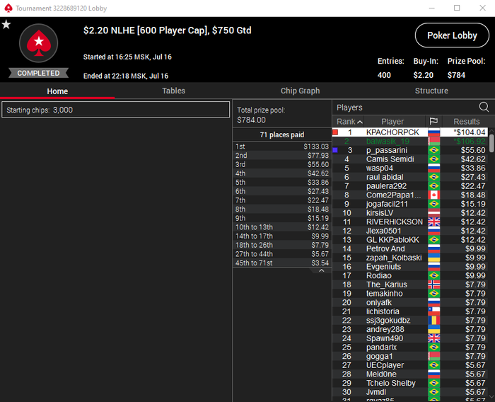Pokerstars 44 турниров (666,85$>>>736,86$) Профит: +70,01$