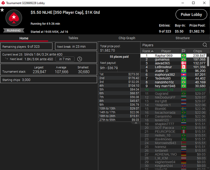 Pokerstars 29 турниров (218,32$>>>266,25$) Профит: +47,93$